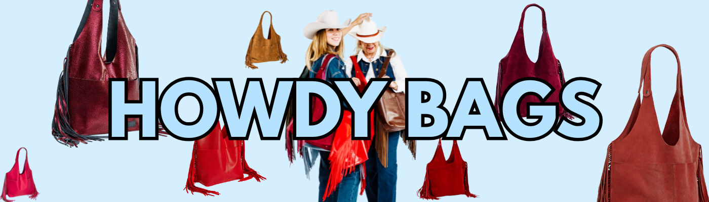 The Howdy bags are handmade suede and leather bags designed by my mom.