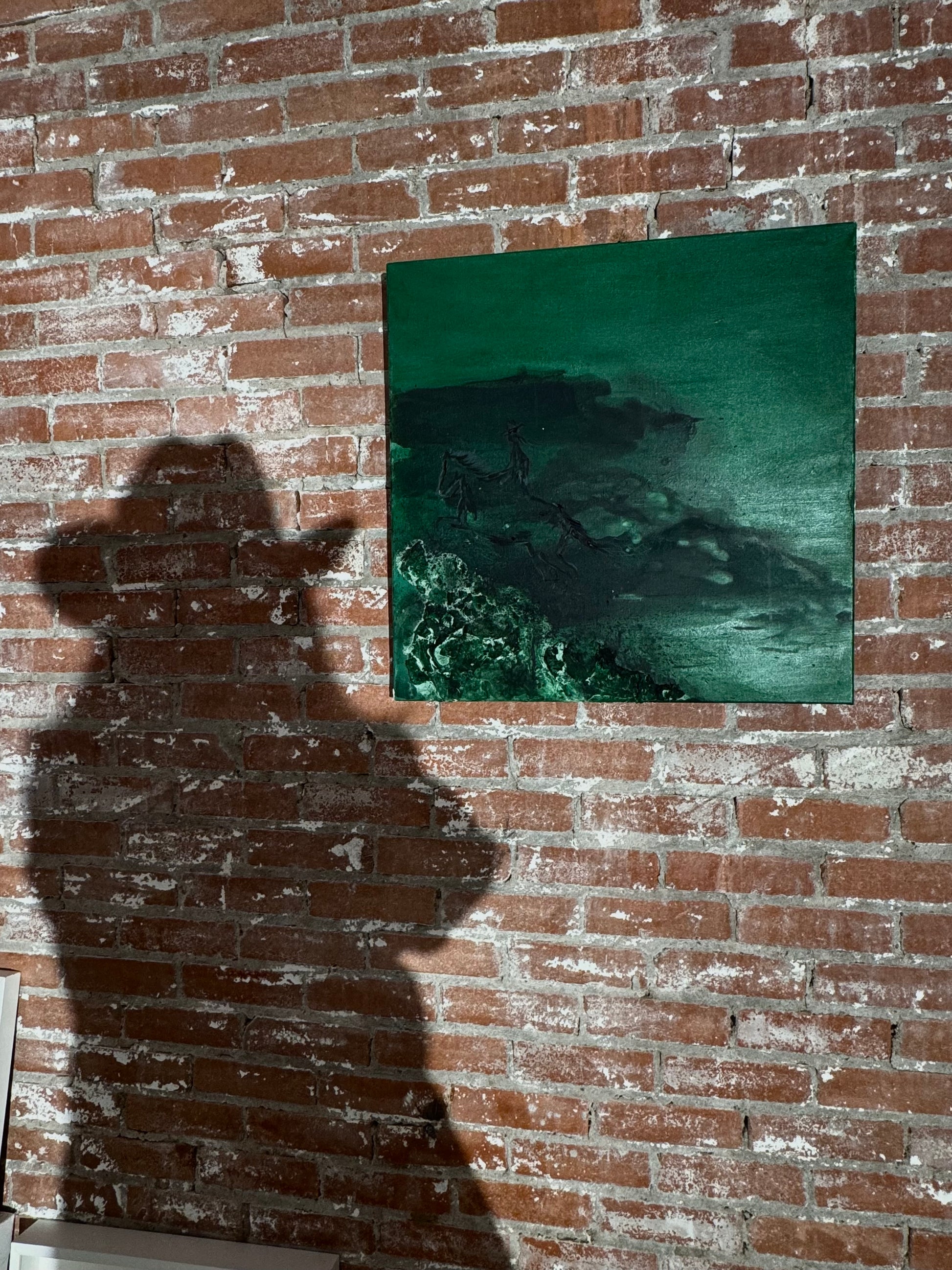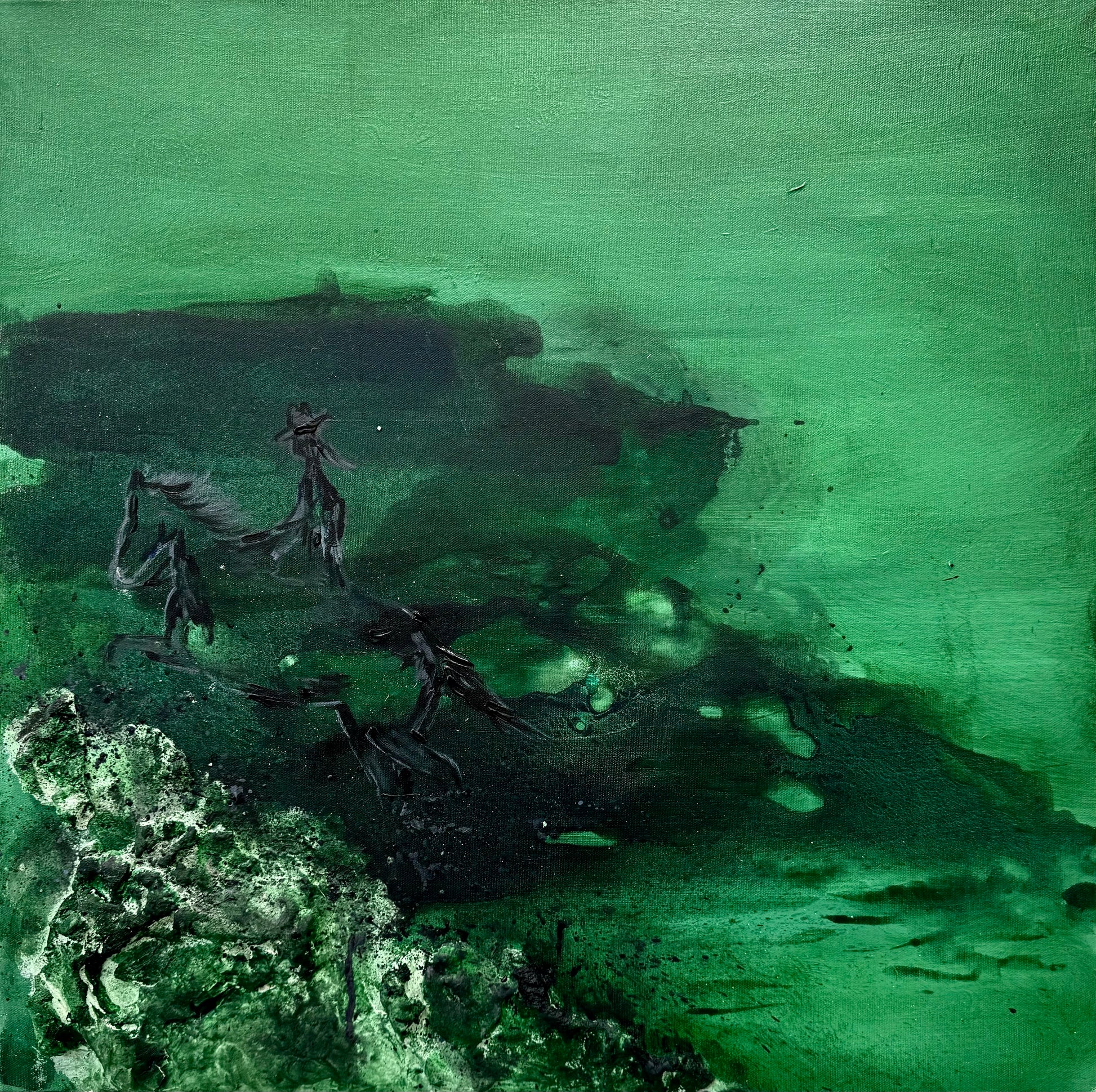 Original hand-painted mixed acrylic, texture and the most intense emerald color.